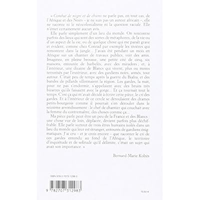 « Combat de nègre et de chiens ne parle pas, en tout cas, de l'Afrique et des Noirs - je ne suis pas un auteur africain -, elle ne raconte ni le néocolonialisme ni la question raciale. Elle n'émet certainement aucun avis. Elle parle simplement d'un lieu du monde. On rencontre parfois des lieux qui sont des sortes de métaphores, de la vie ou d'un aspect de la vie, ou de quelque chose qui me paraît grave et évident, comme chez Conrad par exemple les rivières qui remontent dans la jungle... J'avais été pendant un mois en Afrique sur un chantier de travaux publics, voir des amis. Imaginez, en pleine brousse, une petite cité de cinq, six maisons, entourée de barbelés, avec des miradors ; et, à l'intérieur, une dizaine de Blancs qui vivent, plus ou moins terrorisés par l'extérieur, avec des gardiens noirs, armés, tout autour. C'était peu de temps après la guerre du Biafra, et des bandes de pillards sillonnaient la région. Les gardes, la nuit, pour ne pas s'endormir, s'appelaient avec des bruits très bizarres qu'ils faisaient avec la gorge... Et ça tournait tout le temps. C'est ça qui m'avait décidé à écrire cette pièce, le cri des gardes. Et à l'intérieur de ce cercle se déroulaient des drames petits-bourgeois comme il pourrait s'en dérouler dans le seizième arrondissement : le chef de chantier qui couchait avec la femme du contremaître, des choses comme ça... Ma pièce parle peut-être un peu de la France et des Blancs : une chose vue de loin, déplacée, devient parfois plus déchiffrable. Elle parle surtout de trois êtres humains isolés dans un lieu du monde qui leur est étranger, entourés de gardiens énigmatiques. J'ai cru - et je crois encore - que raconter le cri de ces gardes entendu au fond de l'Afrique, le territoire d'inquiétude et de solitude qu'il délimite, c'était un sujet qui avait son importance. » (B.-M. K.) Ce texte, paru aux Éditions de Minuit en janvier 1990, est suivi de notes (Carnets de Combat de nègre et de chiens).